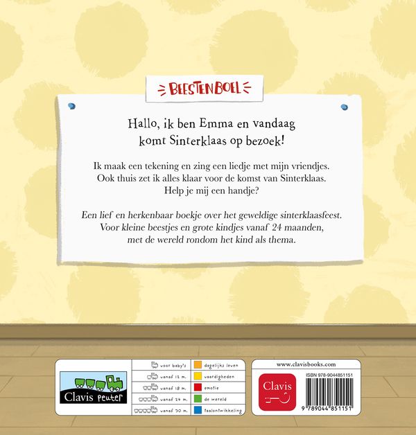 Hallo, ik ben Emma en vandaag komt Sinterklaas op bezoek! Ik maak een tekening en zing een liedje met mijn vriendjes. Ook thuis zet ik alles klaar voor de komst van Sinterklaas. Help je mij een handje? Een lief en herkenbaar boekje over het geweldige sinterklaasfeest. Voor kleine beestjes en grote kindjes vanaf 24 maanden, met de wereld rondom het kind als thema.