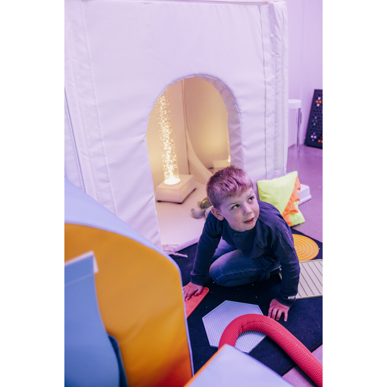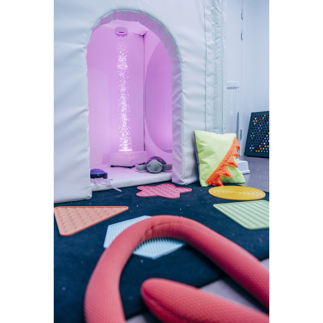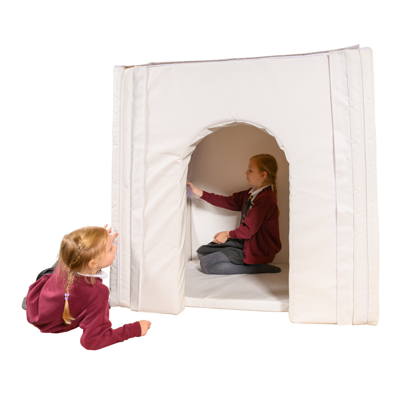 Dit opvouwbare ontwerp is gemakkelijk in elkaar te zetten en creëert snel een schuilplek in elke kamer. De ruimte binnen voelt groter aan dan hij is dankzij de tunnel van spiegels, en de grote deur zorgt ervoor dat je in contact blijft met de buitenwereld. Het is ontworpen om verlicht te worden met een set vezeloptische staarten (niet inbegrepen).