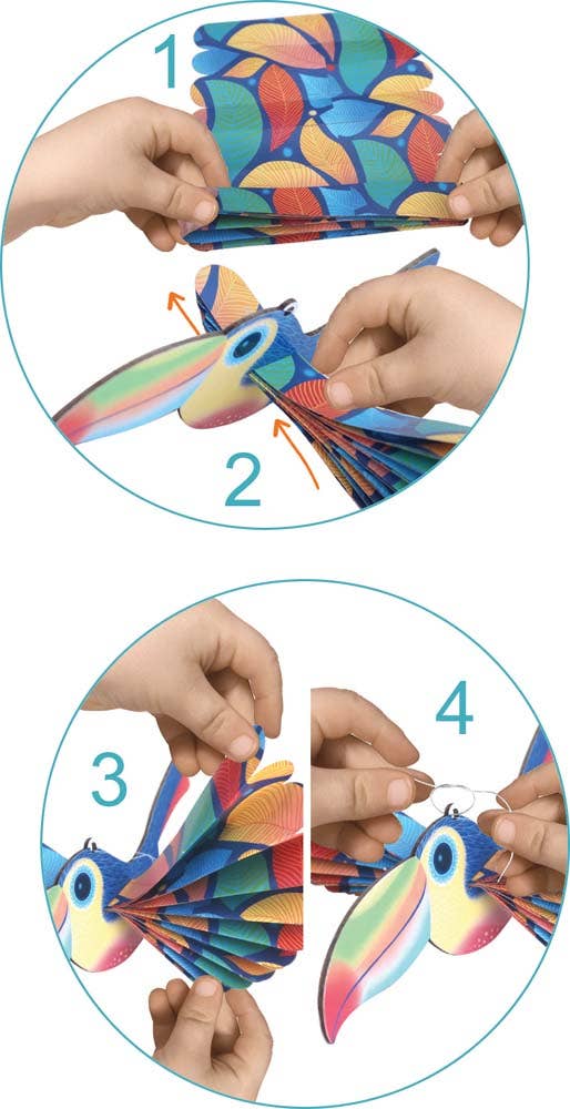 Met de vouwset ‘Exotische vogels’ ontdekken kinderen hoe ze met een eenvoudige waaiervouwtechniek prachtige, kleurrijke vogels kunnen maken. Door de bedrukte papieren stroken te vouwen en samen te voegen, ontstaan unieke exotische vogels die samen een vrolijk eigen vogelverblijf vormen.