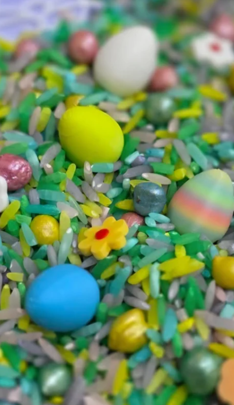 Confetti in vele kleuren en vormen en kleine paasei'tjes. . Kleuren van de items kunnen per zakje verschillen.