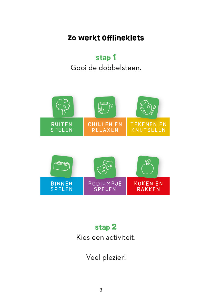 Niet scrollen maar springen, niet klikken maar kletsen, niet schieten maar speuren! Met Offlineklets ontdek je hoe leuk het is om samen tijd door te brengen zonder scherm. In een handig katoenen zakje vind je een dobbelsteen en een boekje vol creatieve, actieve en gezellige opdrachten.