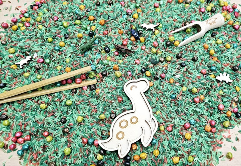 Kikkererwten en pasta zijn geverfd met niet-giftige acrylverf, terwijl de speelrijst is gekleurd met azijn en voedselkleurstof.
