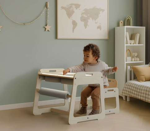 Dankzij de twee verstelbare hoogtes groeit de tafel mee met je kind, en het compacte, ruimtebesparende ontwerp past moeiteloos in elk interieur – van Montessori-geïnspireerde speelhoek tot moderne leefruimte.