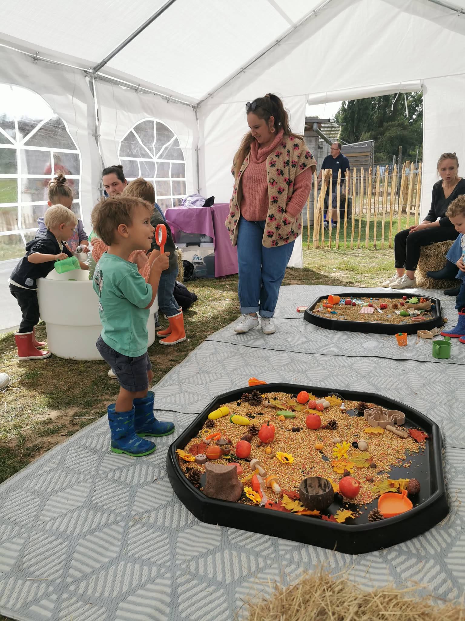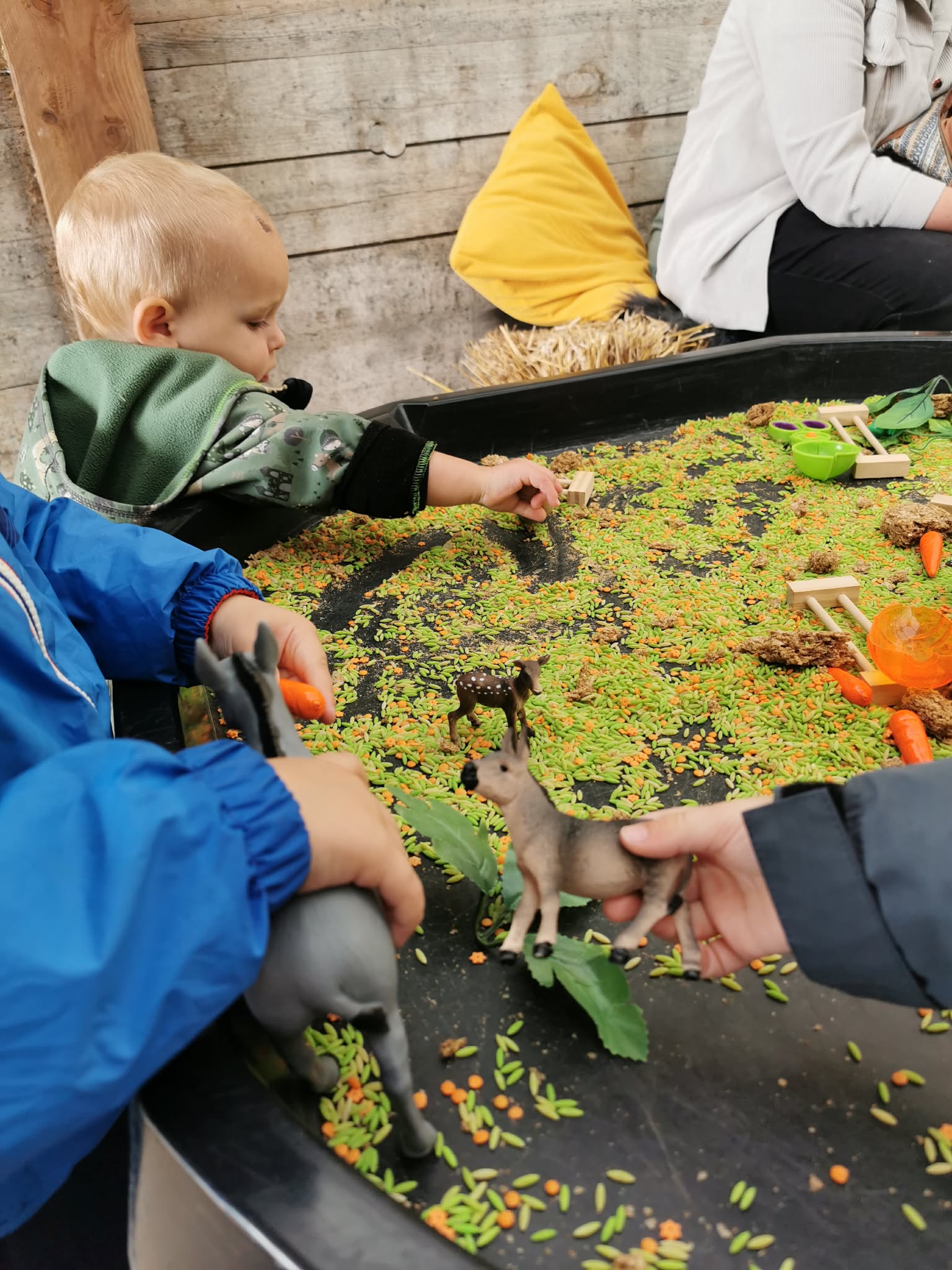 - Vrij spelen aan diverse speeltafels, vol prikkelende materialen geïnspireerd door het leven op de ezelweide