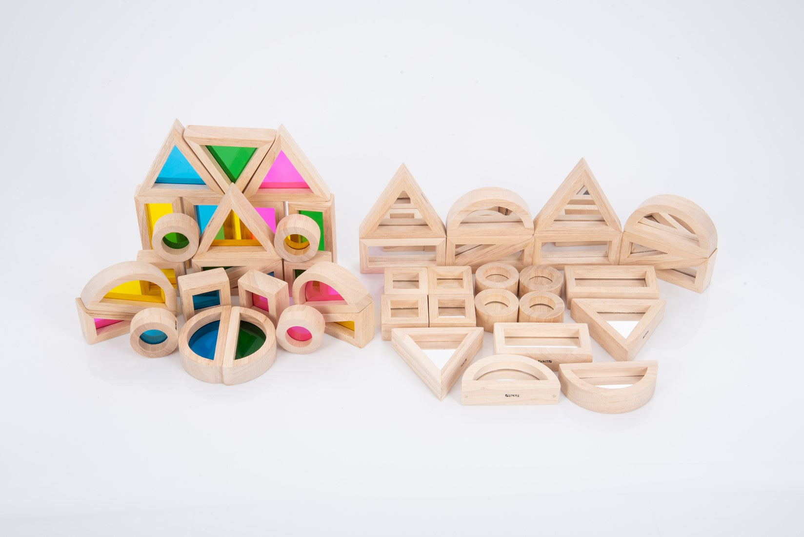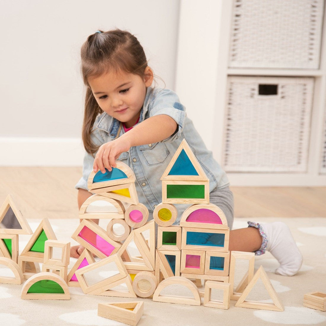 Laat kinderen spelenderwijs vormen, kleuren en licht ontdekken met de prachtige tickit® Rainbow Blocks. Deze stevige houten blokken zijn gemaakt van FSC-gecertificeerd rubberhout en bevatten transparante acrylinvoegen in stralende regenboogkleuren. Perfect voor fantasierijk bouwen, kleurherkenning en het leren over vormen en kleurmenging.