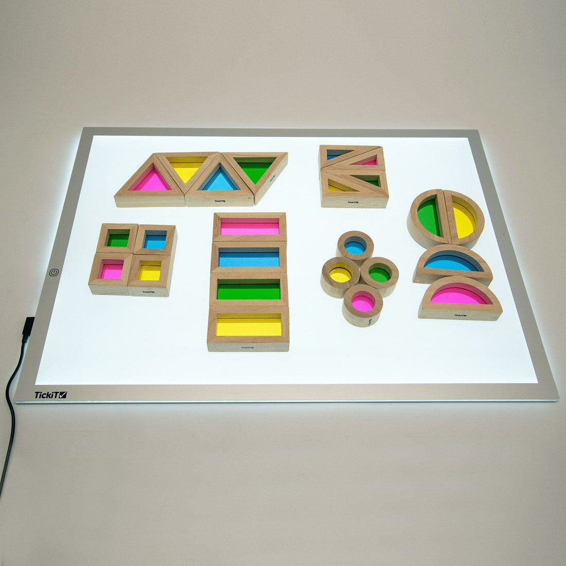 De blokken zijn ideaal voor gebruik op een lichtpaneel, waarbij het gekleurde licht een magisch visueel effect creëert dat de zintuigen prikkelt en de verbeelding stimuleert. De set sluit bovendien perfect aan op de tickit® Spiegelblokset (productcode 73378) – leuk om te combineren!
