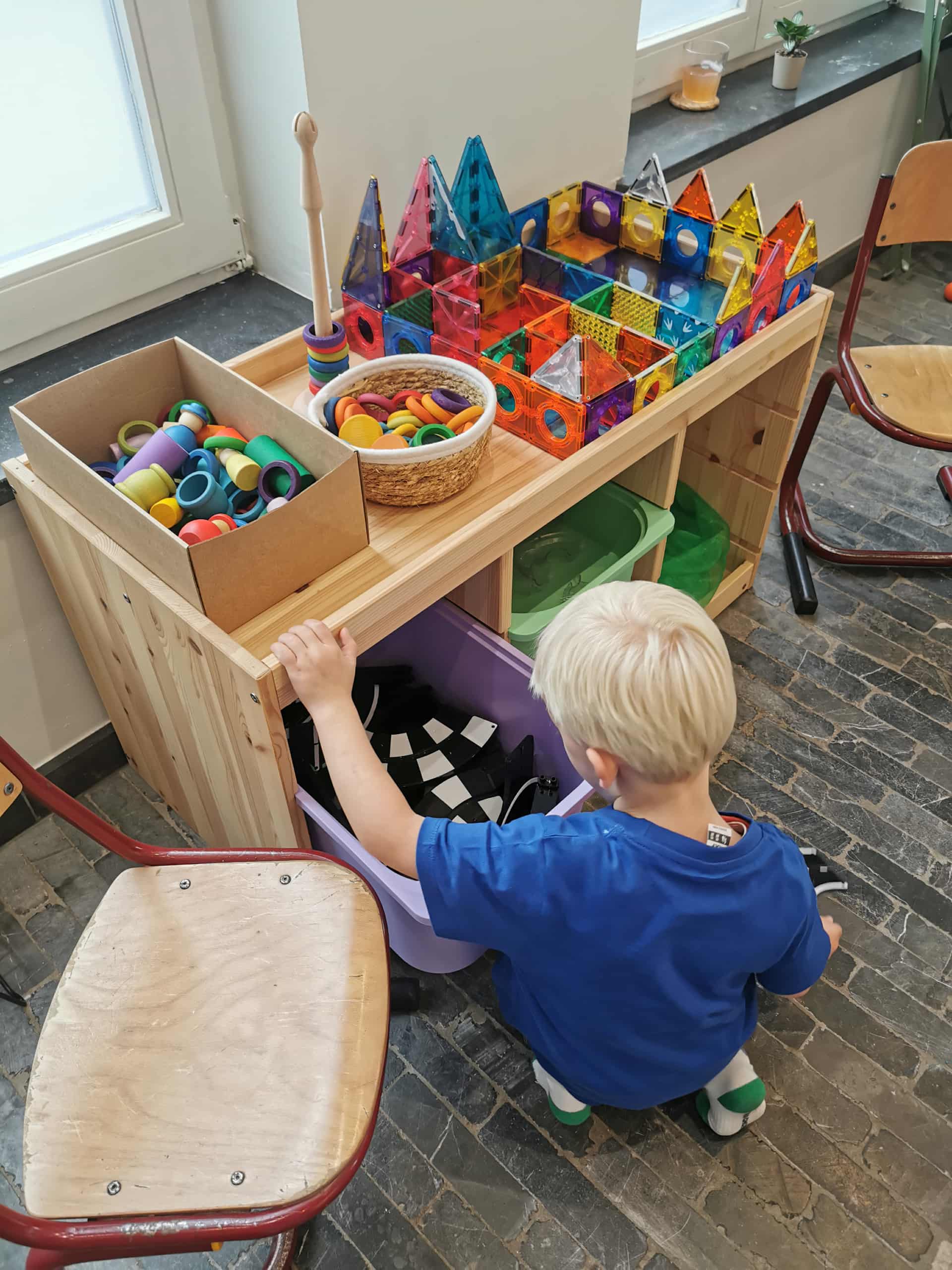 Je kind samen met jou op eigen tempo materialen laten ontdekken die uitnodigen tot open spel, bouwen en fantaseren.