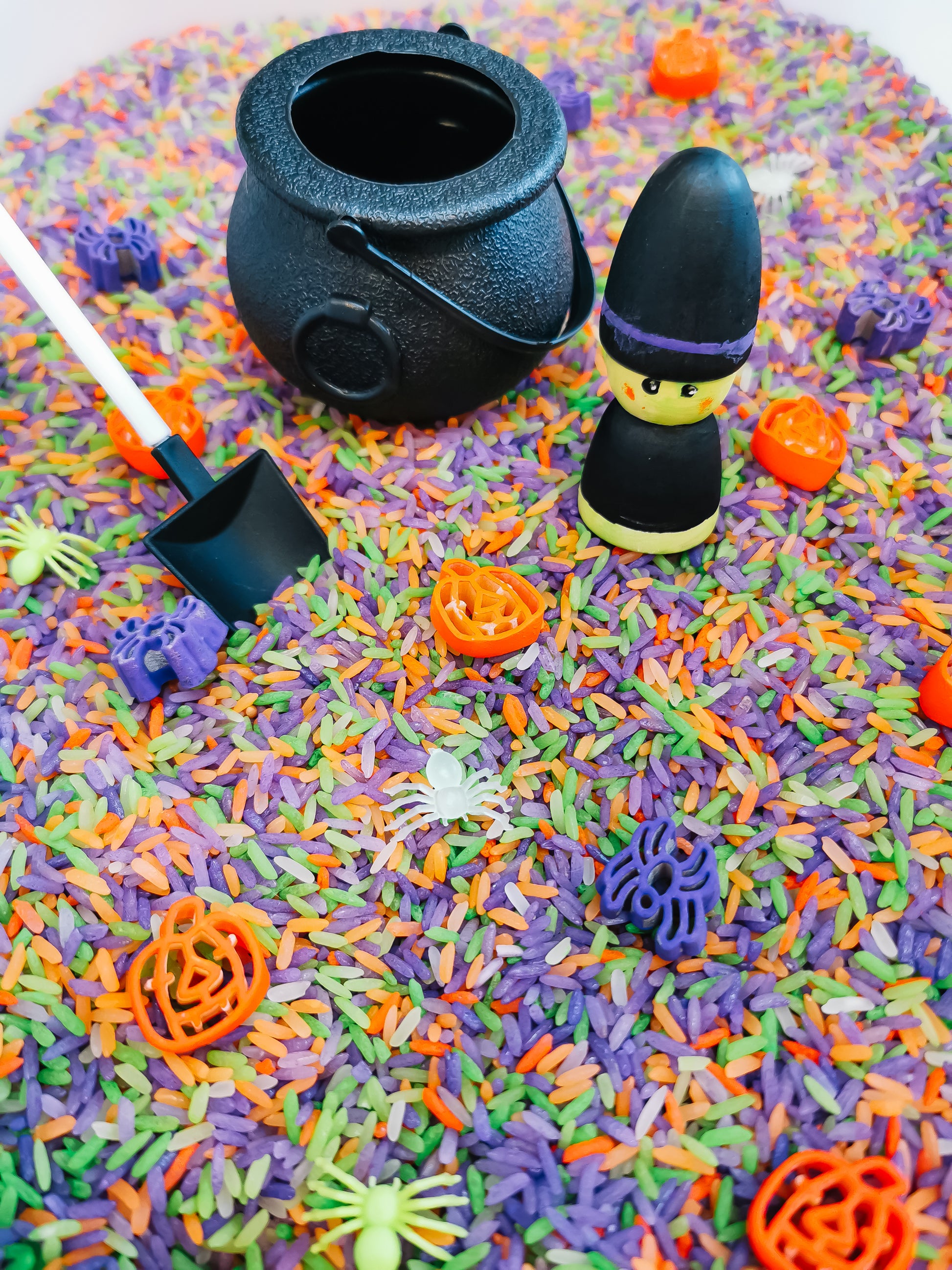 Samen kleuren we rijst, pasta, kikkererwten en andere materialen in typische Halloweenkleuren.