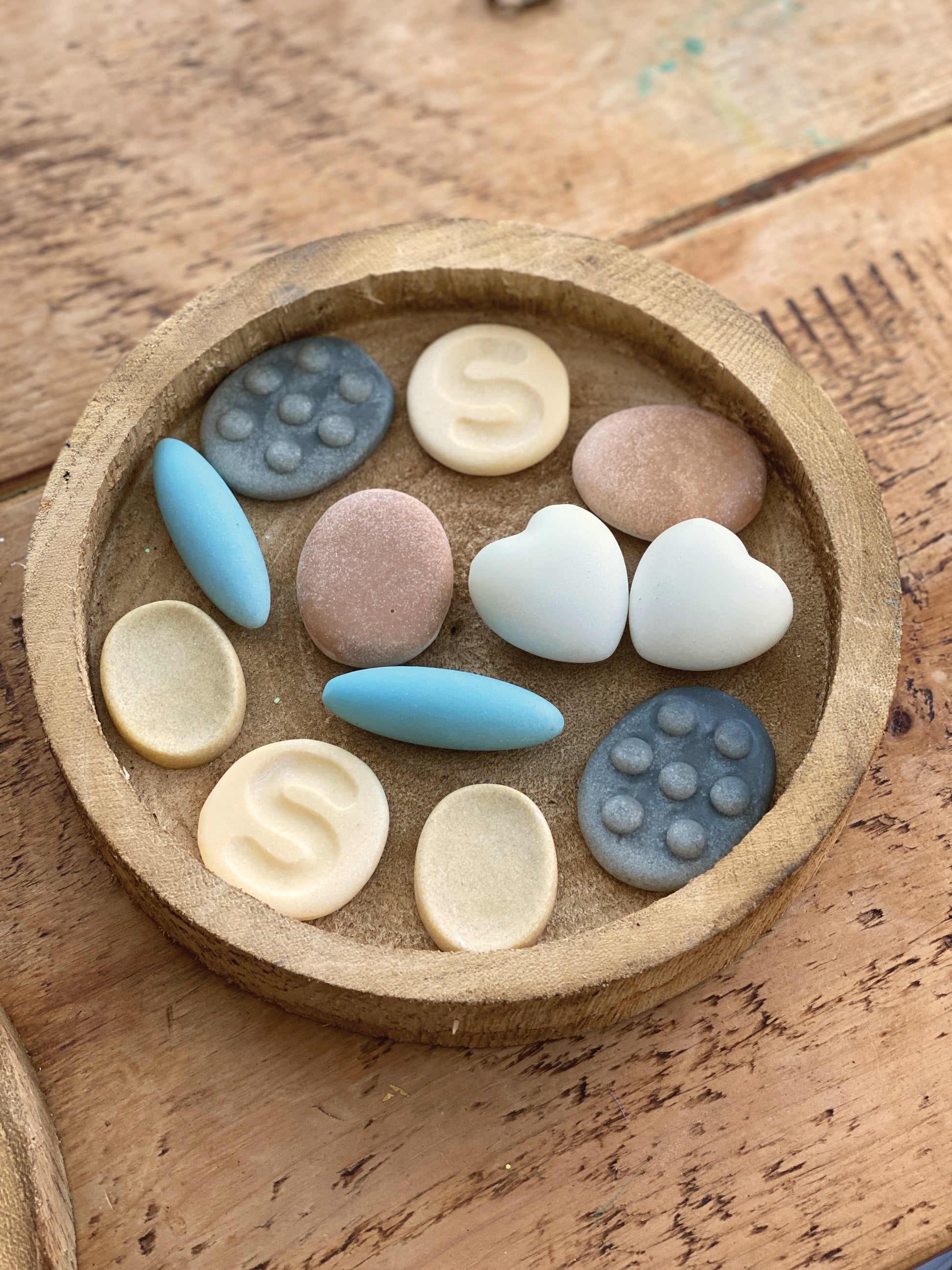 De set bevat twaalf stenen: twee van elk van de zes ontwerpen (hart, ei, gegroefd, knobbelig, tweekleurig en uitgehold).